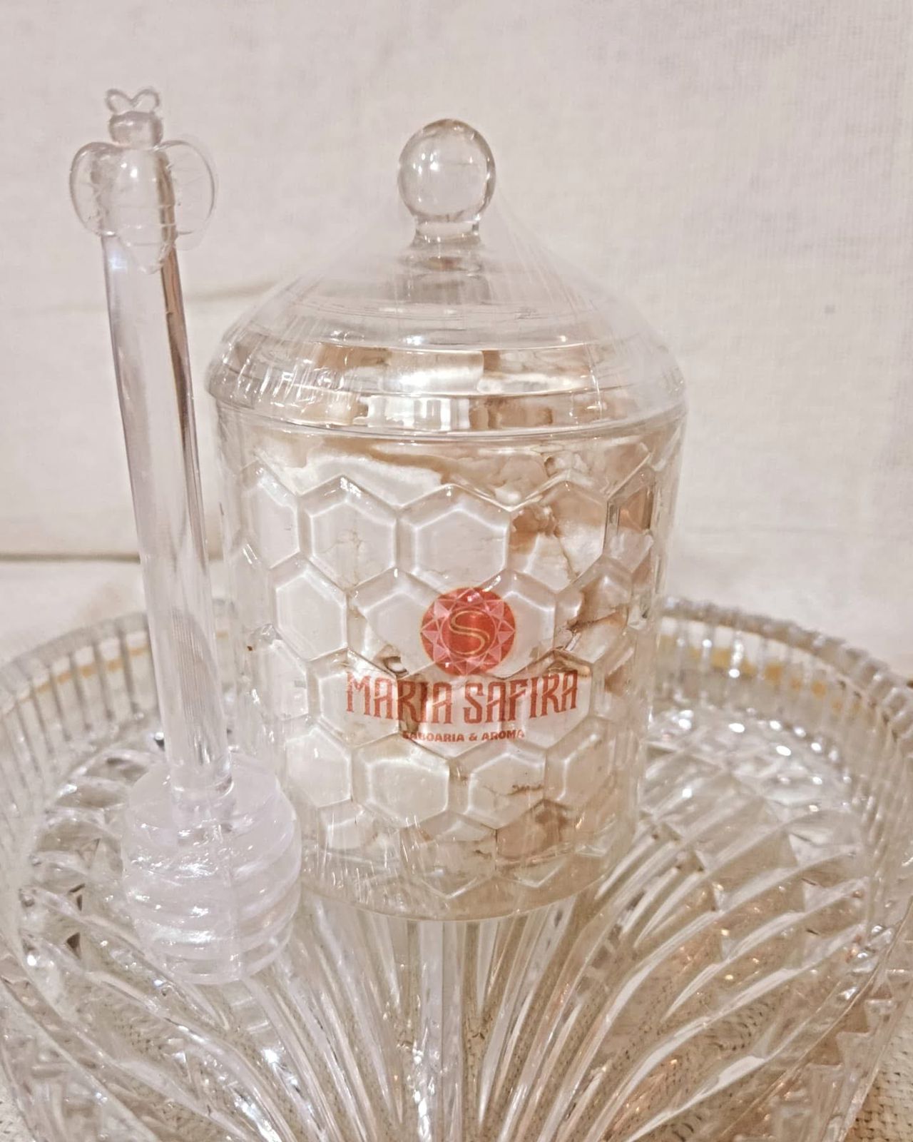 Uma experiência sensorial sublime aguarda, começando pelo brilho etéreo da bandeja de cristal, que acolhe um tesouro em forma de pote de vidro. Inspirado na perfeição da natureza, o pote em formato de fava de mel guarda um segredo suave: o Mousse Hidratante de mel e extrato glicólico de baunilha, um carinho nutritivo para a pele.