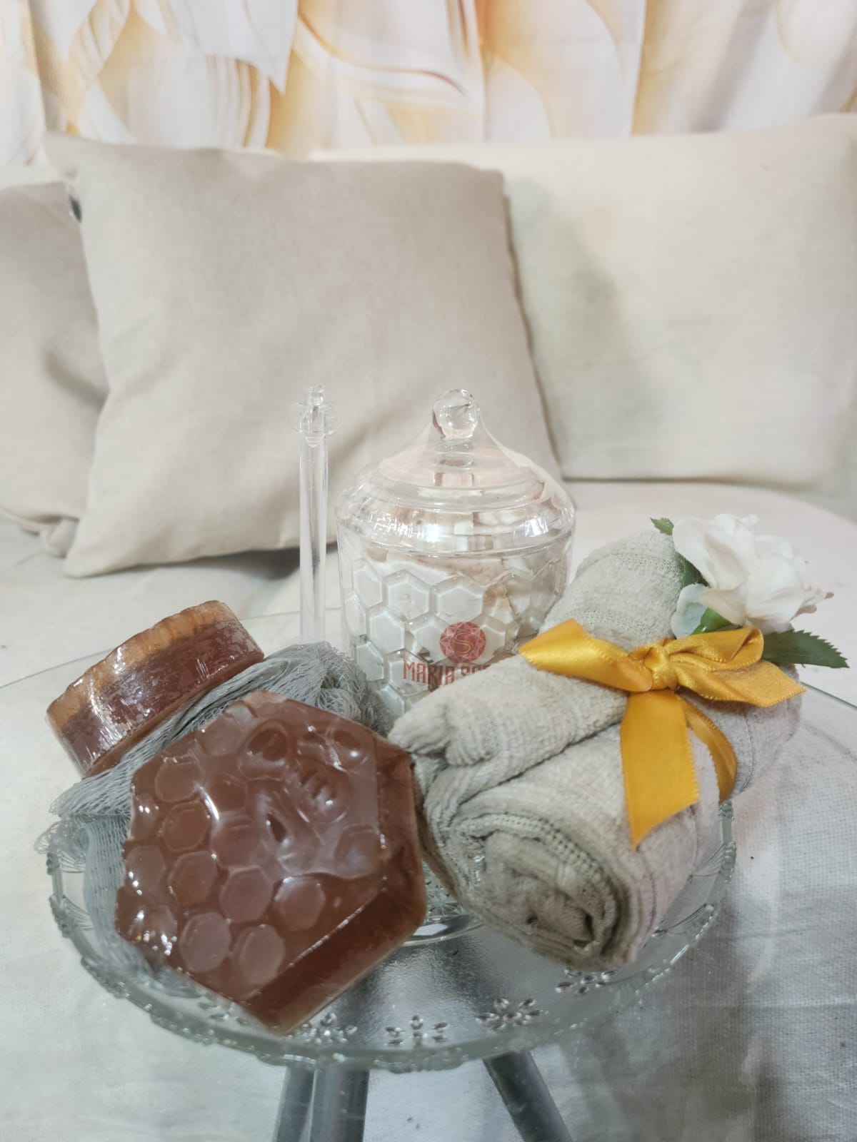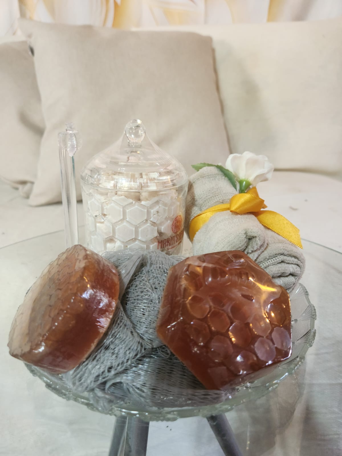 Para completar este ritual de bem-estar, uma suave esponja de nylon e uma Toalha Aveludada cor bege, um abraço macio após o deleite. Melodia de Ouro: um presente para os sentidos, onde a sofisticação encontra a doçura em perfeita harmonia. ✨🍯