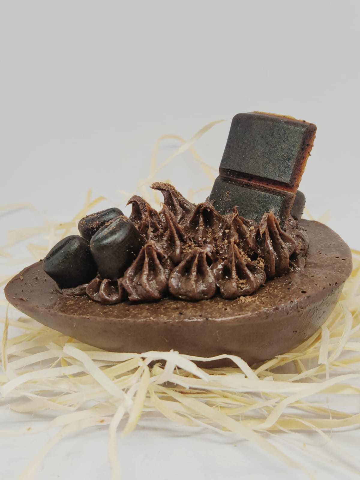 Composição: cacau em pó, café em pó, café Gourmet coado, glicerina hipoalergênica, extrato de cacau, óleo de amendôas, essência de chocolate ao leite, corante hipoalergênico, lauril de côco, essência de leite de cabra, óleo de aveia, chocolate em barra derretido, café Gourmet coado com chocolate, extrato de leite de cabra.